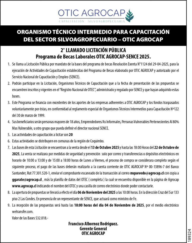 Nota: Enviar el comprobante escaneado de la transacción al correo mquevedo@agrocap.cl con copia a ggarate@agrocap.cl , agregando la planilla de datos del OTEC (completa), la cual, se encuentra disponible en esta página (planilla compra de bases), indicando el nombre del OTEC y una casilla de correo electrónico donde poder contactarle.